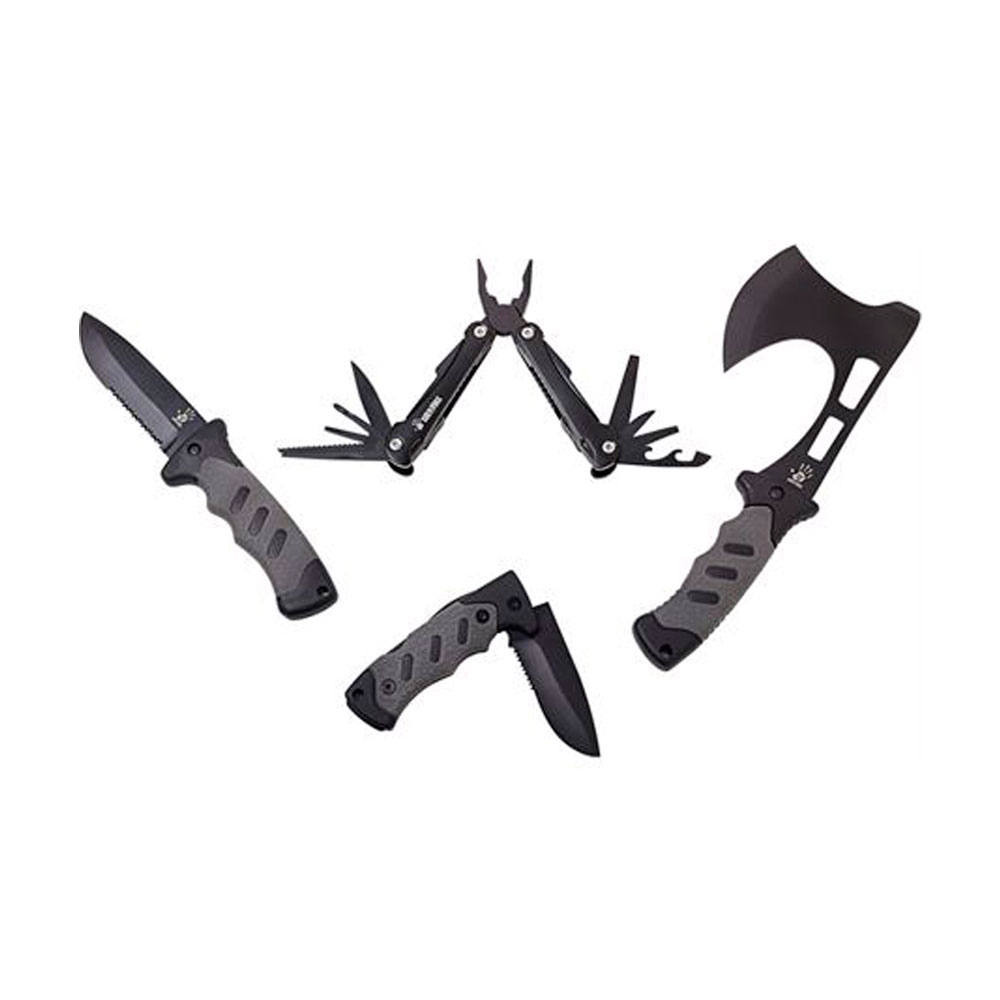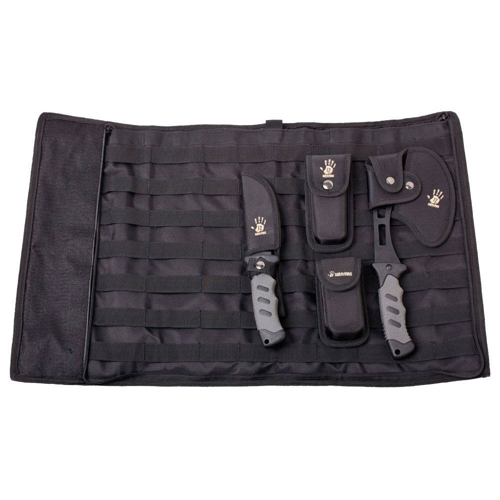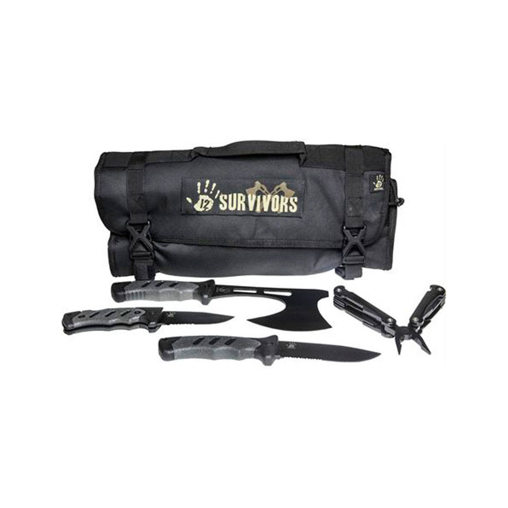 A 12 Survivors késkészlet a kültéri "túléléshez" szükséges alapvető eszközöket tartalmazza rendezett, praktikus, feltekerhető csomagolásban. Található benne rendkívül masszív pengés kés fűrészes éllel, összecsukható kés, fejsze és egy multifunkciós szerszám. Alapvetően minden szituációra kínál megoldást, amivel szabadtéri tevékenységei során találkozhat a felhasználó.