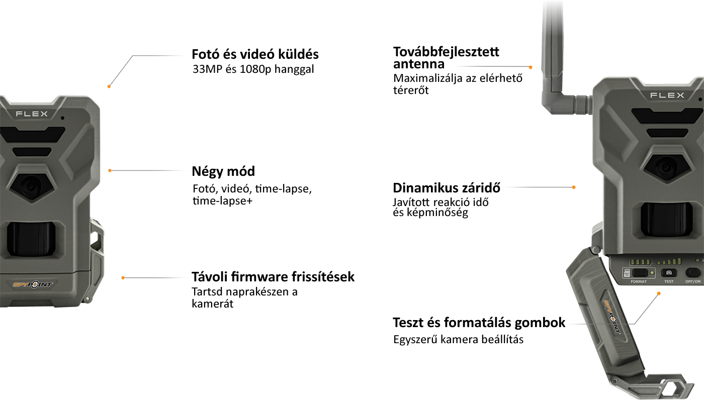 A SPYPOINT FLEX egy átgondoltan innovatív vadkamera, mely funkcióit és teljesítményét illetően pontosan az Ön igényeihez és preferenciáihoz igazítható, így az aktív vadászati szezonban mindig készen áll az értékes információ küldésére.
