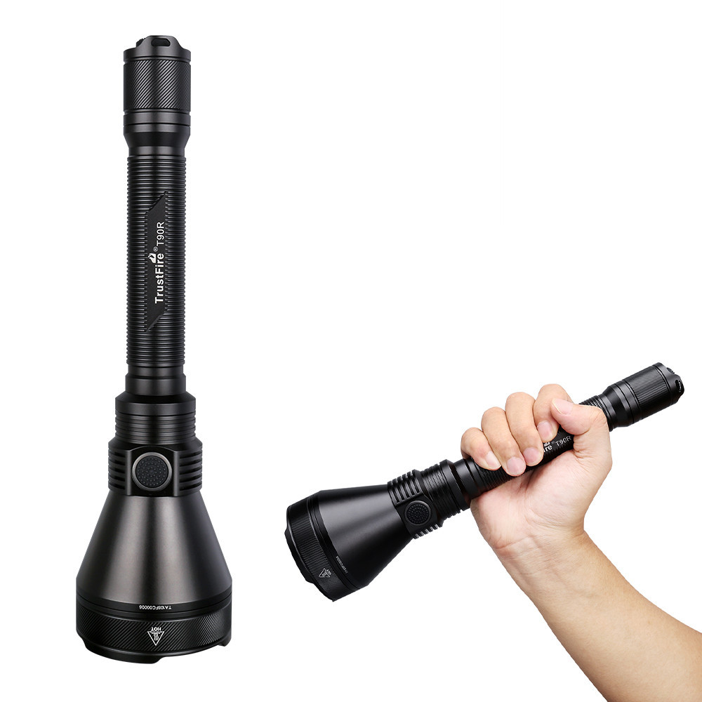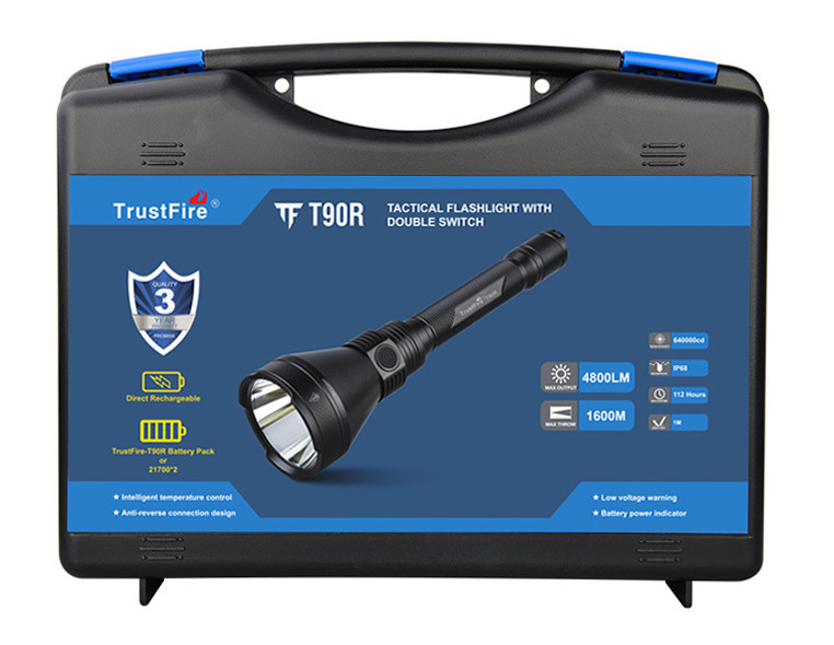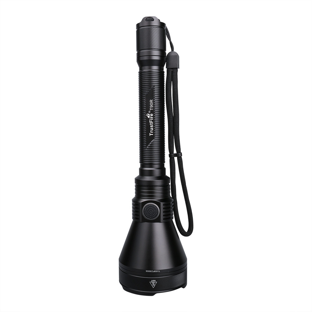 A Trustfire T90R egy csúcskategóriás vadászlámpa, akár 2600 lumen fényerősségre képes 1600m hatótávolsággal. 4 fényerő fokozattal ellátott (magas, közepes, alacsony és holdfény) valamint stroboszkóp funkciót is kapott ez a kiváló ár-érték arányú, dupla kapcsolós eszköz.