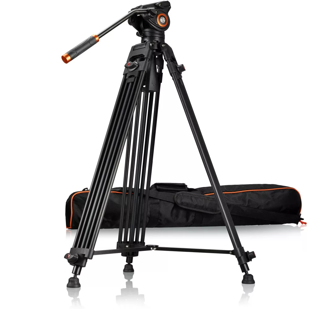 The BRESSER VT-01 Tripod is a robust video and camera tripod with a professional fluid tilt head and the perfect companion in the video studio or the photo studio. The aluminium video tripod is particularly stable thanks to the central spider. Due to the twist locks, the height of the tripod legs can be changed quickly, and the video tripod can be perfectly aligned by using the built-in spirit level.
