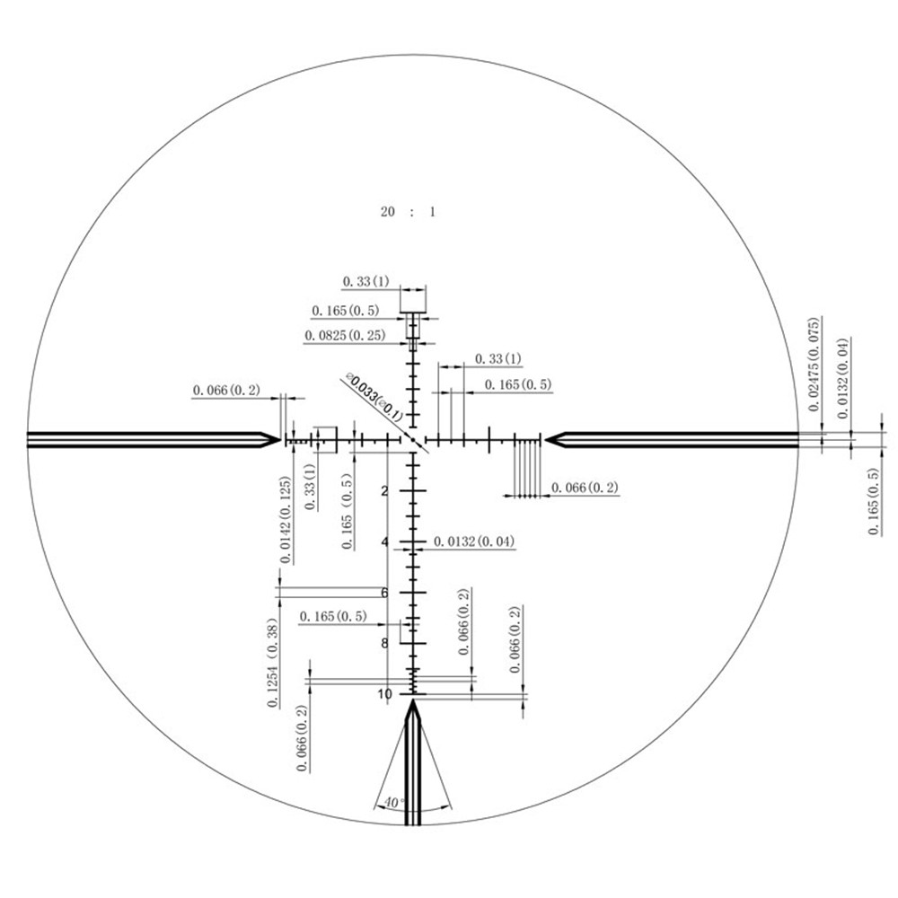 The DDMP Tactical Spotter features an integrated MIL tactical reticle that matches the reticle of DDoptics DDMP scopes. Lying in the first image plane, it increases in size according to the magnification set. Distances can be precisely calculated with the help of different stopping points. The DDMP Tactical Spotter can transmit detailed measurement and correction information to the shooter, who in turn can precisely compensate for point deviations. For this purpose, the lines in the center of the tactical reticle are divided into full, middle and small lines, with a full line equaling 1 MRAD (10cm at 100m). The intermediate lines are divided accordingly (0.5 MRAD: 5 cm, 0.25 MRAD: 2.5 cm).