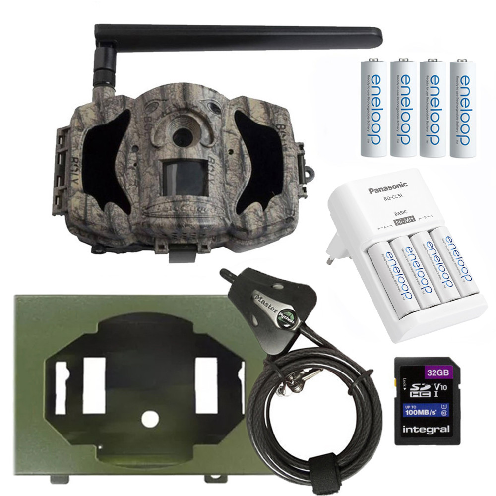 trail camera, belting, USB cable, Bolymedia console, charger, 8pcs AA 1900 mAh battery, security box, 32Gb SD card, safety cable.