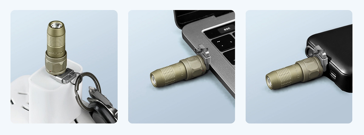 The integrated USB-C plug allows direct charging from a phone adapter, laptop, power bank, or car USB port — no extra cable required. The upgraded flip-cover design enables charging without removing the light from your keychain.