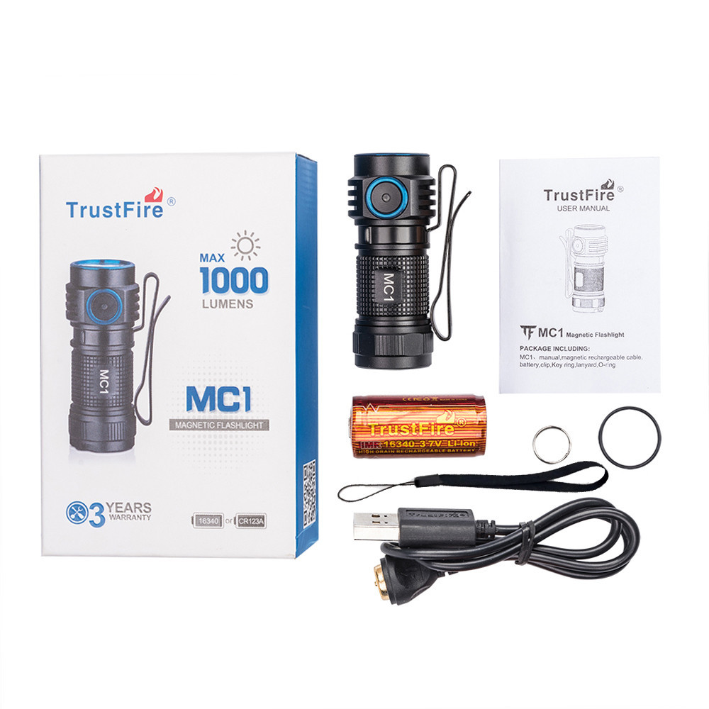 MC1, 650 mAh RCR123A battery, magnetic charging cable, O ring, key ring, manual