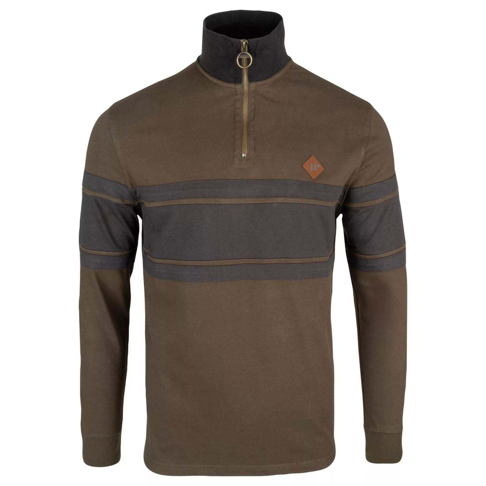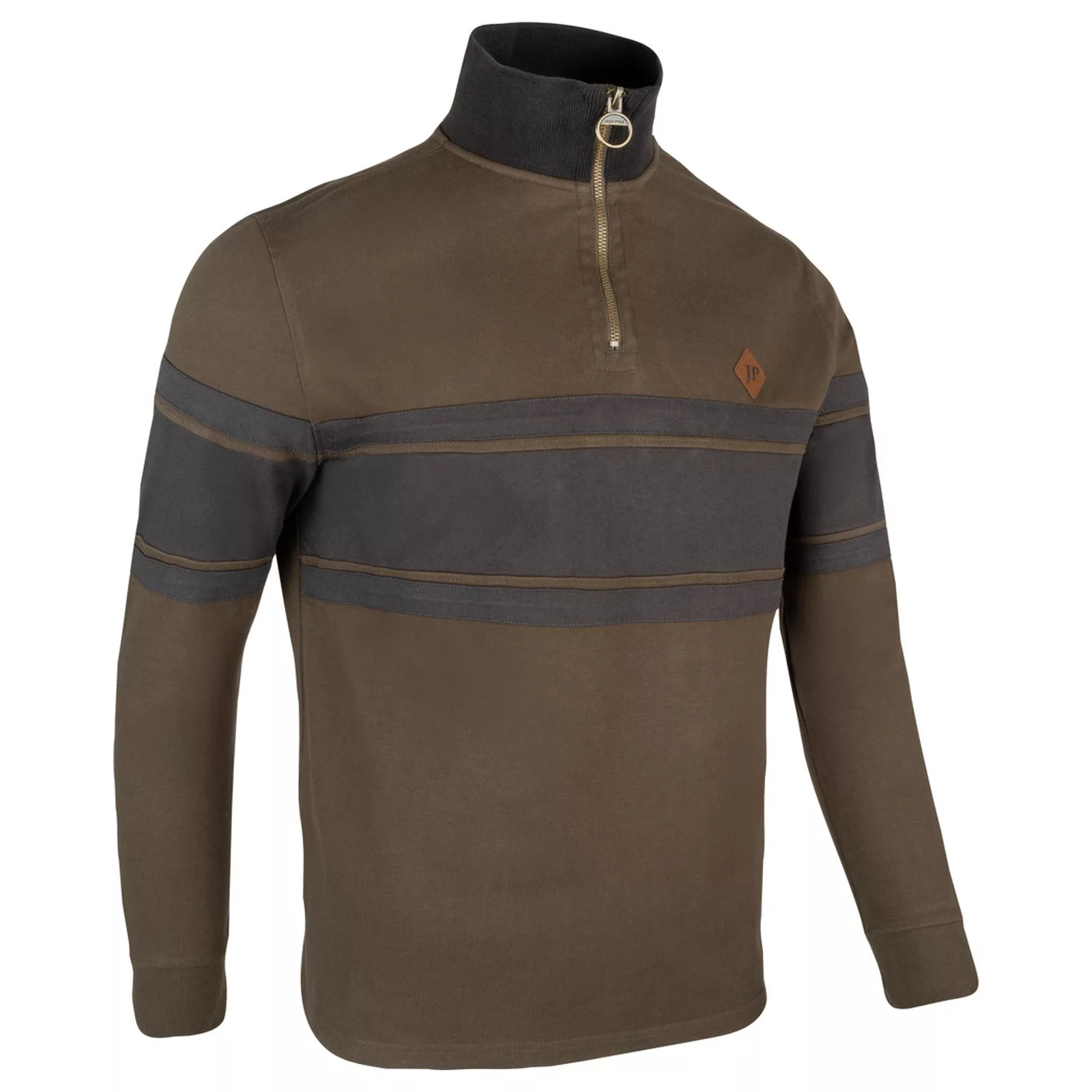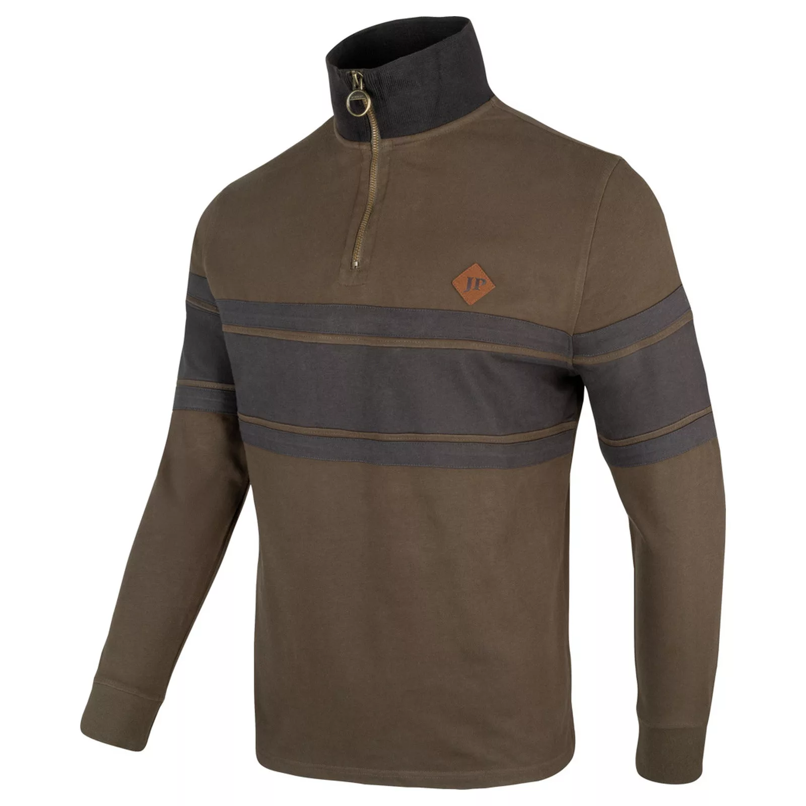 A Half Zip Contrast pulóver a kényelmes viseletet elegáns, vidéki hangulatú megjelenéssel ötvözi. A magas, álló gallér fémgyűrűs cipzárral, a mellkason és ujjakon futó kontrasztos panelek, valamint a diszkrét JP mellkasi embléma prémium megjelenést kölcsönöznek.