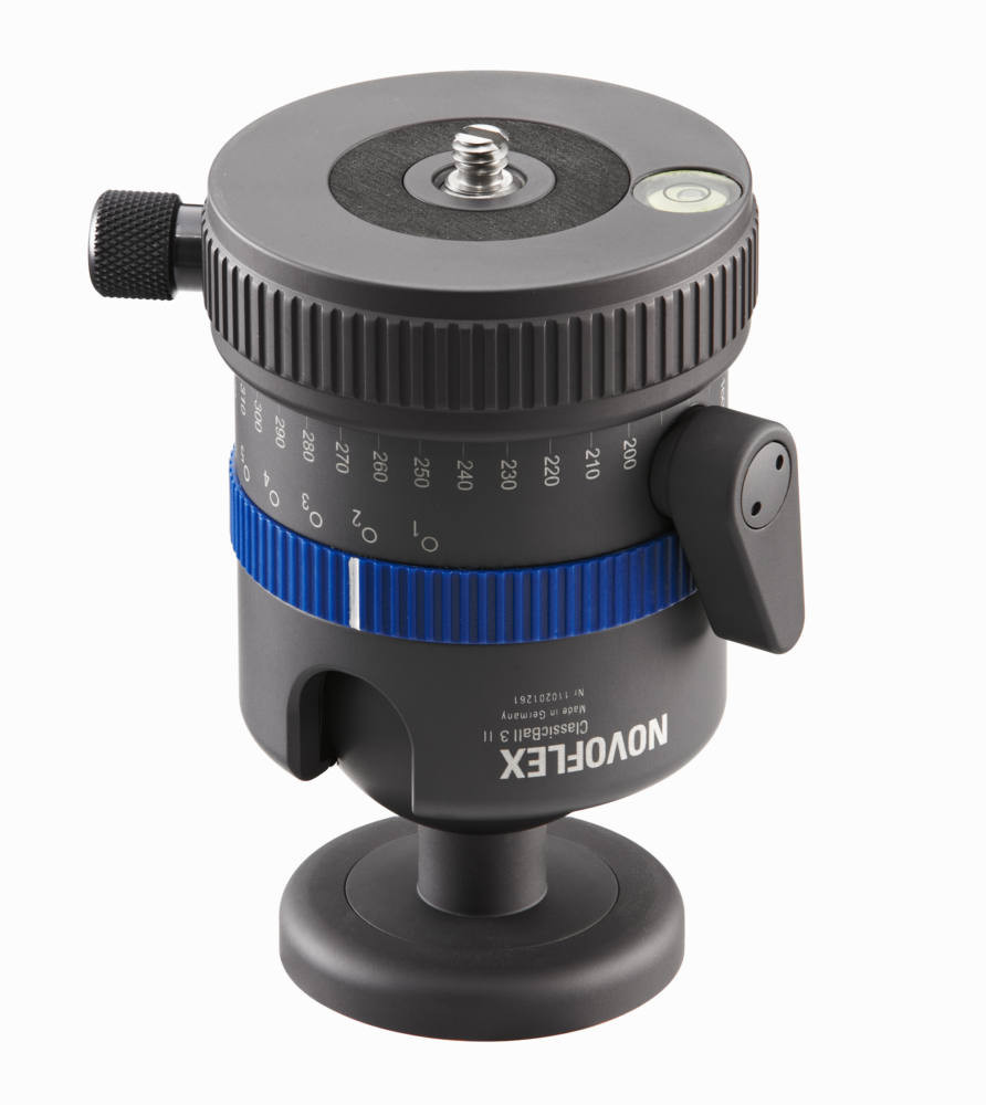 A profik és amatőrök körében egyaránt népszerű NOVOFLEX ClassicBall 3 most teljesen új, továbbfejlesztett változatban kapható. A II-es változat egy igazi, 360°-ban elforgatható panoráma alappal rendelkezik. A ház alján lévő jelzések lézer bevéséssel készültek. A panoráma funkciónál a gömbfej lefelé fordított helyzetben van; ez biztosítja a 100 %-os pontosságot a ferde horizonttal készülő panoráma felvételek elkerülése érdekében. A CB5 II-nél beépített vízmérték szolgálja a tökéletes szintezést, így ehhez már nem szükséges állítani az állványlábak hosszát. A CB3 II és a vadonatúj MonoLite billenőfej kombinációja két irányban billenthető fejet alkot finom mozgatásokkal, másodpercek alatt.