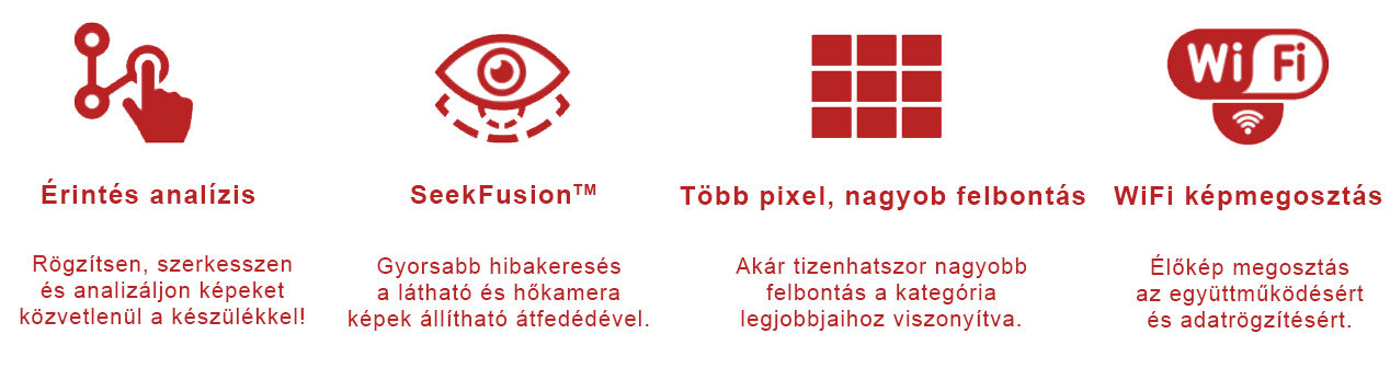 Új funkcióként már mobilkészüléken is megjeleníthetjük a hőkamera képét. A beépített WiFi stream funkció és a mobil áruházakból letölthető SeekView applikáció segítségével bármely okostelefon diagnosztikai eszközzé válhat munkánk során.